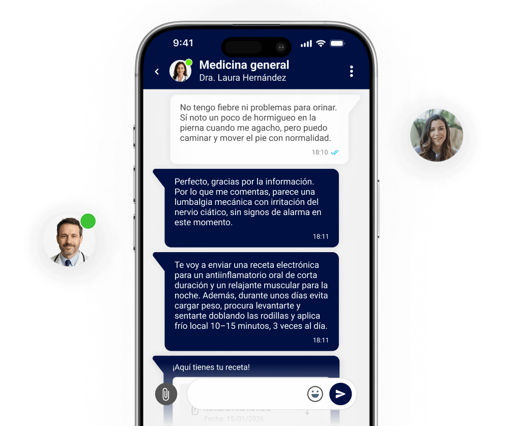 Es un servicio de telemedicina en tiempo real que permite a tus asegurados, empleados o clientes contactar con médicos colegiados en menos de 2 minutos a través de chat. El servicio opera 24/7, con receta digital, informes médicos y derivación a especialistas o red propia si es necesario.