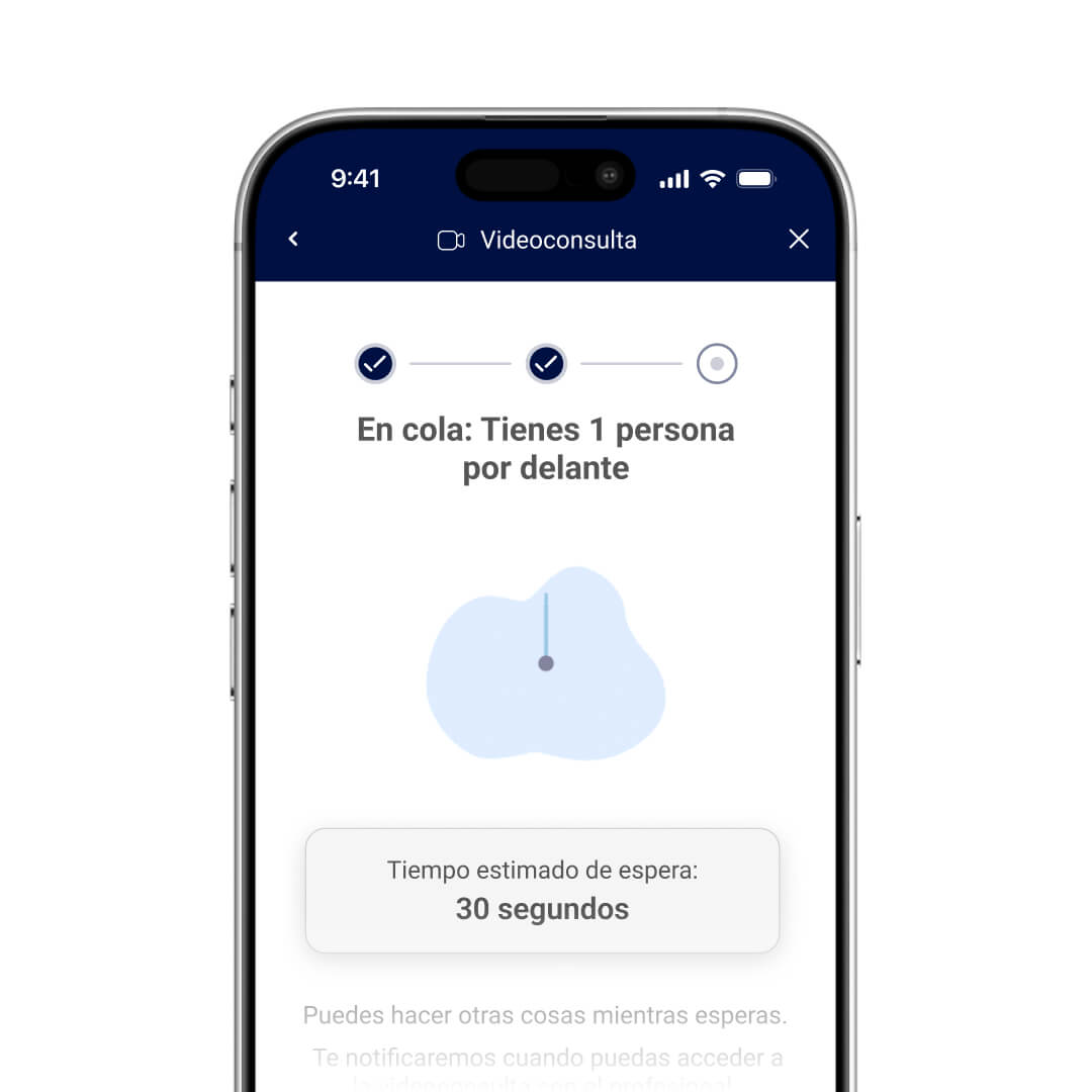 Al solicitar la videoconsulta médica, el usuario entra en nuestra sala de espera, donde es informado del tiempo de espera (siempre inferior a 2 minutos), reduciendo la tasa de abandonos.